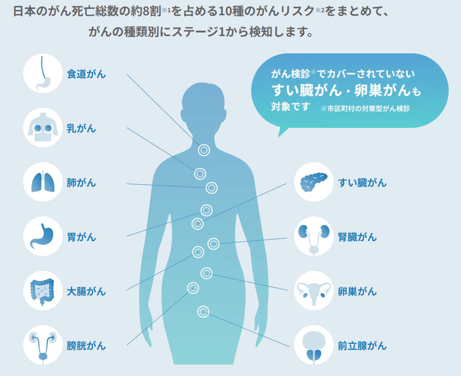 最大10種類のがんを一度にチェック:男性:肺がん、胃がん、大腸がん、膵臓がん、食道がん、腎臓がん、膀胱がん、前立腺がん女性:上記に加え、乳がん、卵巣がん